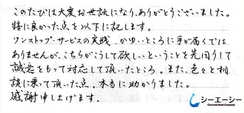 こうしてほしいということを先回りして誠意をもって対応していただいた。