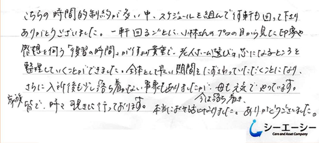 全体として長い期間をたずさわっていただくことになり、さらに入所後も少し落ち着かない事象もありましたが、今は落ち着き、母も元気でやっています。